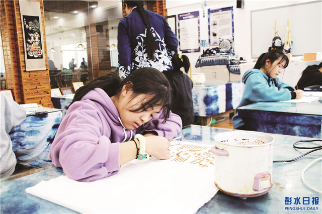 中國彭水網(融媒體記者 向玉婷 攝影)近年來,彭水注重民族文化教育,突出辦學特色,挖掘刺繡、蠟染、剪紙等傳統工藝,開設民族特色課堂,以學校教學為載體,開展民族文化教育教學,傳承民族民間技藝,將民族文化與旅游相結合,推進全縣文旅融合發展。圖為縣職教中心學生正在學習苗族蠟染。