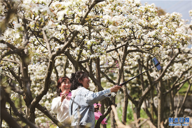 (融媒體記者 趙 勇 攝影)3月13日,隨著氣溫回升,不少市民利用周末時光,走出家門,踏青游玩,樂享春日好時光。圖為保家鎮一梨園內,市民正在花間拍照。