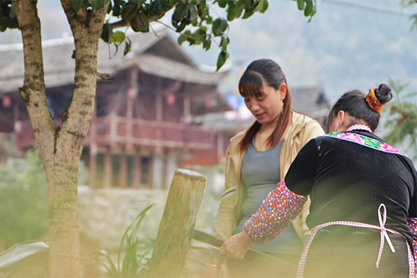 村民羅萬祿曾經(jīng)老、破、窮的祖宅如今已變成接待游客的農(nóng)家樂,廚房里,羅萬祿正張羅著中午的農(nóng)家飯。在苗寨吃飯,必不可少的特色打糍粑。