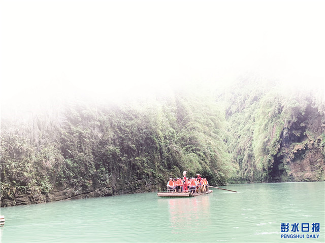 旅行社踩線團徒步游覽阿依河,進入曲徑通幽的青龍谷,體驗竹筏放歌,觀賞原生態自然風光,體驗休閑、探險。阿依河碧潭秀水,風光秀美,一行人被阿依河的獨特美景所陶醉。