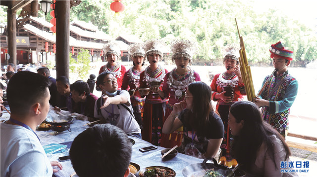 晚上,旅行社體驗了苗族特色餐。彭祖山景區代表李弋非常喜歡苗家特色菜,他告訴記者,“第一次來彭水,摩圍山自然風光優美,空氣清新,天氣涼爽,適合夏季避暑。苗家美食也非常好吃,色香味俱全,我吃得非常開心。”