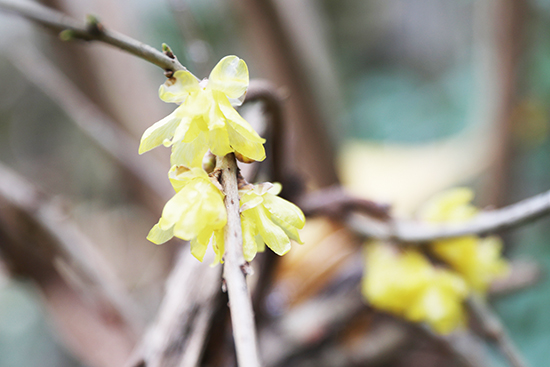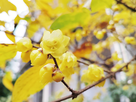 在山谷公園里,一株株臘梅已迎風盛開,幾近透明的黃色杯狀花瓣密密麻麻地生長在沒有葉子的枝椏上,星星點點,蠟一般晶瑩剔透,俏皮而可愛。