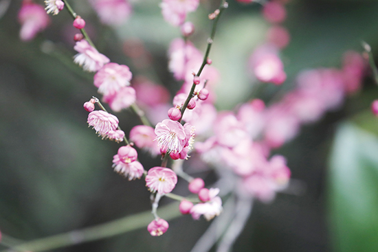 來到沙沱社區三橋附近,便會覺得暗香撲鼻,沿著公路便可以看到道路兩旁錯落有致的紅梅花,清雅的花香隨著寒風陣陣浮動,湊上前細看,粉紅的花朵仿佛金雕玉鏤一般,有些還裹著絲絲紫紅色的花蕊,顯得分外澄澈晶瑩。