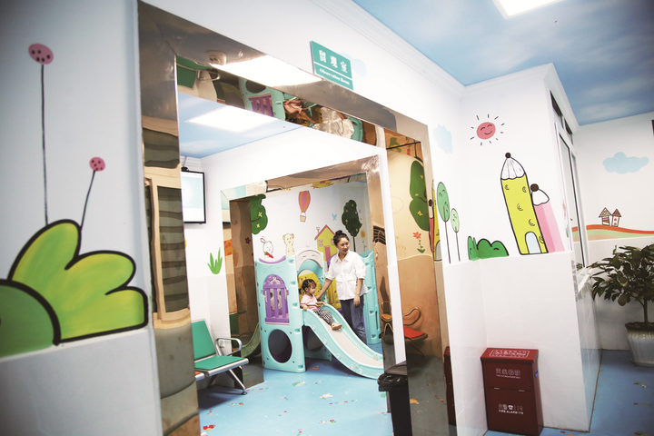 記者注意到,整個接種區內,布滿卡通圖案的墻壁、舒適美觀的沙發凳、留觀區內的兒童滑梯,眼前的場景讓人仿佛置身兒童樂園。不少剛接種完的孩子在家長的陪同下正在留觀區玩耍。
