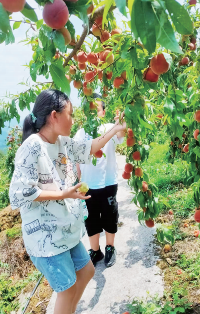 在烏江村蘋果桃種植專業合作社種植園內果樹有序排列著,一個個粉紅的桃果掛在樹上,像蘋果似的,碩大飽滿,果香在園中氤氳開來,令人垂涎欲滴。游客穿梭在果園里,摘選、品嘗著蘋果桃,享受采摘的樂趣。