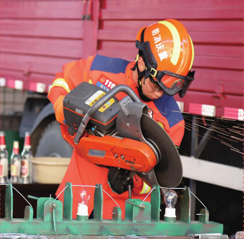 記者來到沙陀消防救援站,見到了正在進行技能訓練的消防員汪勝,烈日灼燒在他的臉上,兩手緊緊握著電鋸,汗水順著他的臉頰不住地往下流,身上的滅火防護服從里到外都被汗水浸濕透。但他手上的動作絲毫不馬虎,手起刀落之間,與燈泡僅毫米之差的鋼絲全部被割斷,而燈泡卻毫發無損。